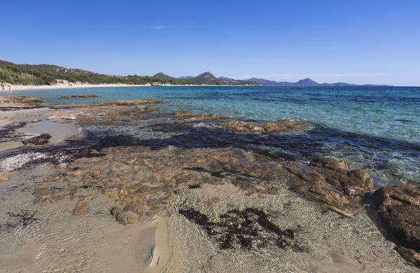 The golden lights of sunrise are reflected on the blue sea and cliffs Punta Molentis Villasimius Cagliari Sardinia Italy Europe