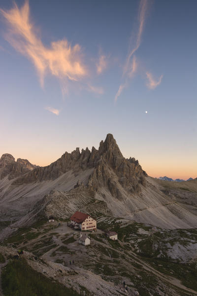 Mount Paterno and Locatelli Refuge at sunset, Bolzano Province, Trentino Alto Adige, Italy.