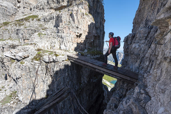 Sesto/Sexten, Dolomites, South Tyrol, province of Bolzano, Italy. Climber on the via ferrata
