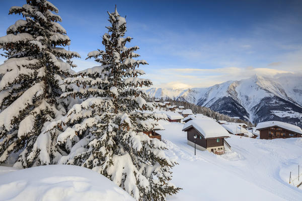 Sunset frames the mountain huts and woods covered with snow Bettmeralp district of Raron canton of Valais Switzerland Europe