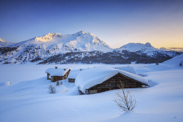 Pink sky at sunset frames the snowy mountain huts and church Bettmeralp district of Raron canton of Valais Switzerland Europe