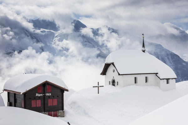 Clouds above the mountain huts and church covered with snow Bettmeralp district of Raron canton of Valais Switzerland Europe
