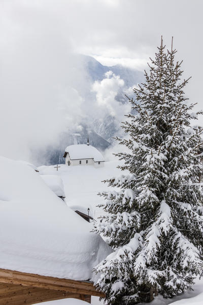 Tree covered with snow frames the alpine church Bettmeralp district of Raron canton of Valais Switzerland Europe