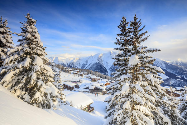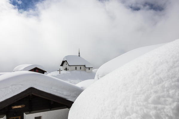 Clouds frame the mountain huts covered with snow Bettmeralp district of Raron canton of Valais Switzerland Europe