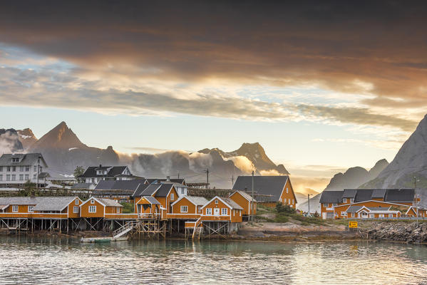 Sunset on the fishing village frames by rocky peaks and sea Sakrisoya Nordland county Lofoten Islands Northern Norway Europe