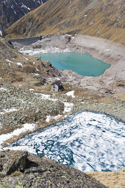 View of Lago Rotondo during thaw and Lake Baitone Val Malga Adamello Regional Park province of Brescia Lombardy Italy Europe