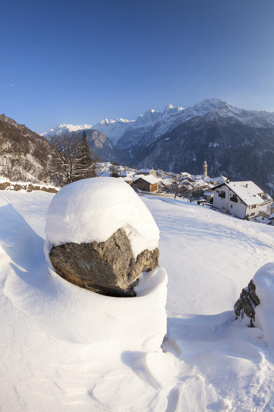 Sunset on the snowy village of Soglio canton of Graubünden Maloja District Bregaglia Valley Engadine Switzerland Europe