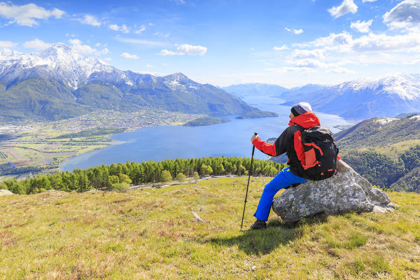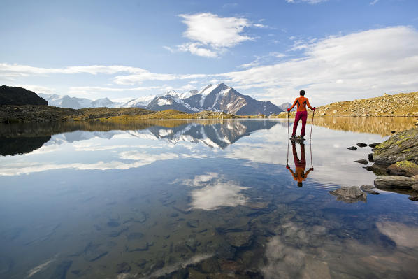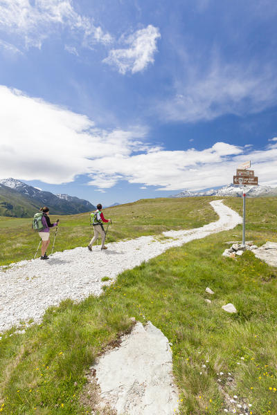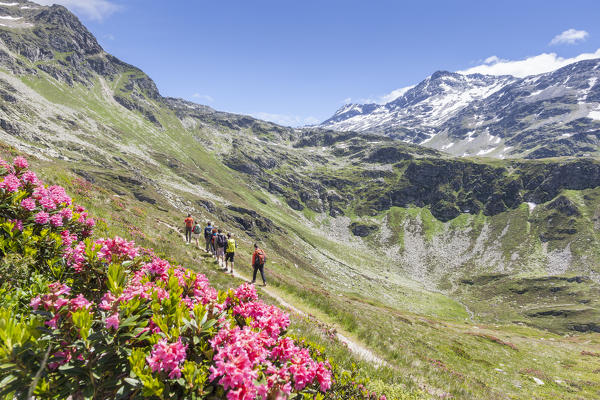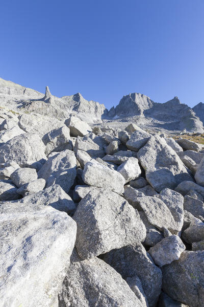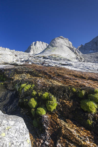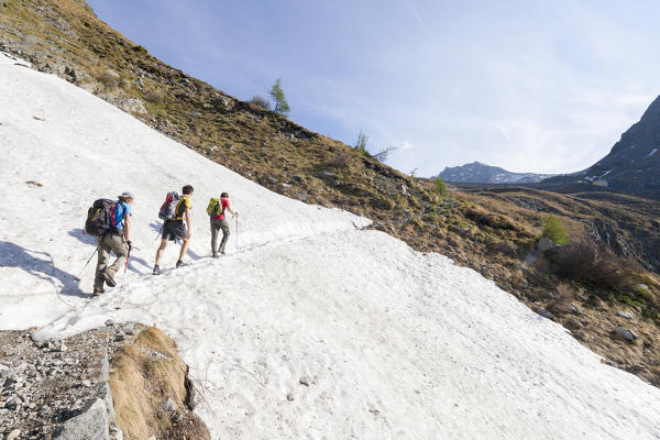 Hikers proceed under the blue summer sky Porcellizzo Valley Masino Valley Valtellina Sondrio Province Lombardy Italy Europe