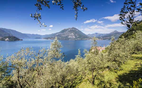 Cherry trees around the village of Varenna surrounded by the blue water of Lake Como Province of Lecco Lombardy Italy Europe