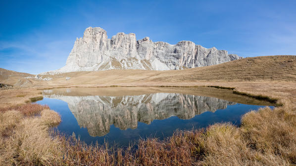 Larch trees during autumn and Tofana di Rozes in the background, Dolomites, Cortina d'Ampezzo, province of Belluno, Veneto, Italy