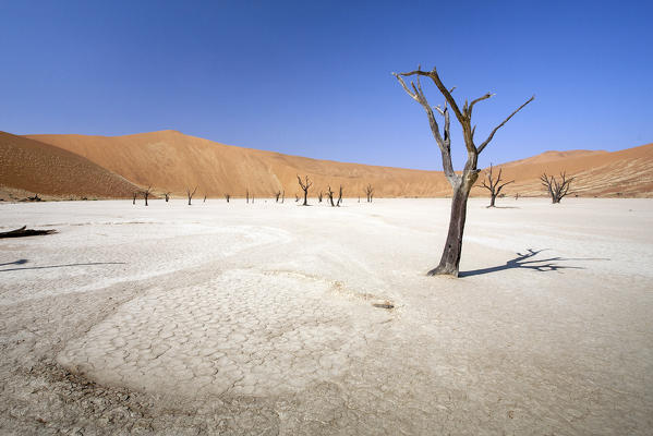 Parched ground and Dead Acacia surrounded by sandy dunes Deadvlei Sossusvlei Namib Desert Naukluft National Park Namibia Africa