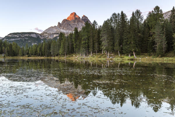 Last lights of the day illuminate the Three Peaks, Antorno Lake, Auronzo di Cadore, Belluno district, Veneto, Italy, Europe