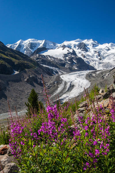 Blooming willowherb flowers (epilobium) framing the glacier and the snow-capped peaks of the Bernina group in the Valley of Morteratsch - Engadine, Switzerland Europe