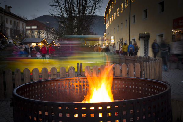 an image of a bonfire with a little train passing behind the fire, during the Christmas market in the city of Bruneck, Bolzano province, South Tyrol, Trentino Alto Adige, Italy, Europe