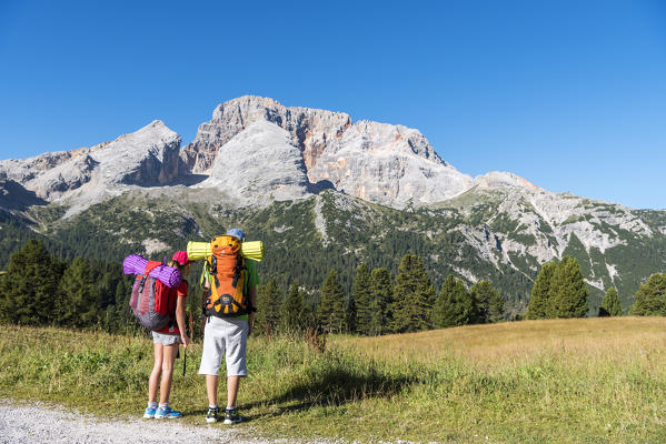 Prato Piazza/Plätzwiese, Dolomites, South Tyrol, Italy. Two children admire the mountains above the Prato Piazza/Plätzwiese. In the background the Croda Rossa/Hohe Gaisl