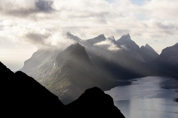 Top view of lakes and sea under the cloudy sky at summer Reinebringen Moskenes Lofoten Islands Norway Europe