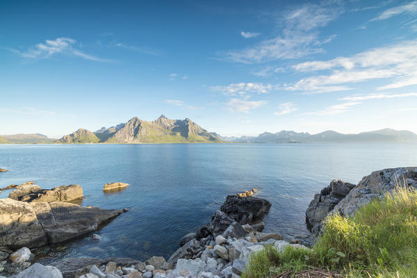 Sun shines on the blue sea and the rocky peaks at night during summer Vikten Nord Trøndelag Lofoten Islands Norway Europe