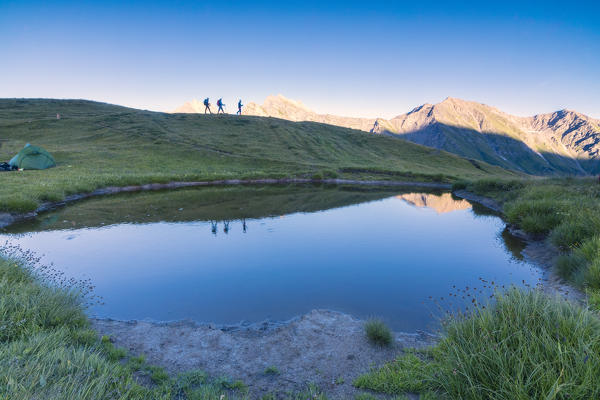 Silhouettes of hikers are reflected in the lake with Mont De La Saxe on the background Courmayeur Aosta Valley Italy Europe