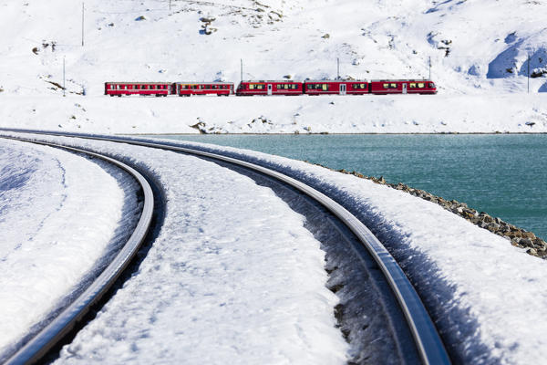 Bernina Express train in the snowy valley surrounded by Lake Bianco Bernina Pass Canton of Graubünden Engadin Switzerland Europe