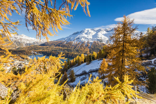 Yellow larches frame Sankt Moritz and blue lake with snowy peaks in background Canton of Graubünden Engadine Switzerland Europe