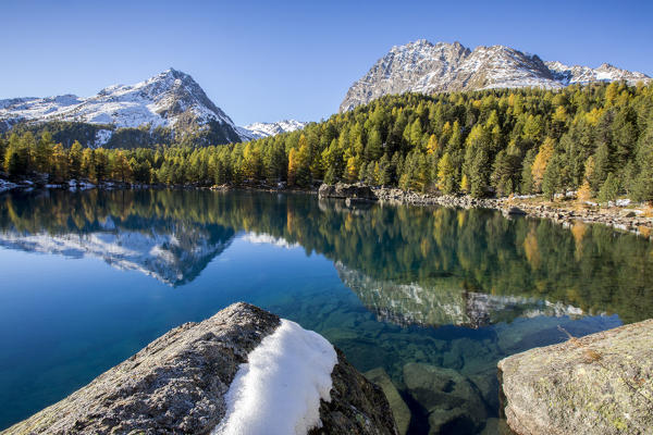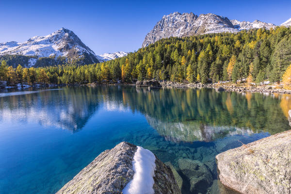 Blue sky on the snowy peaks and yellow larches Bernina Pass Poschiavo Valley Canton of Graubünden Engadine Switzerland Europe