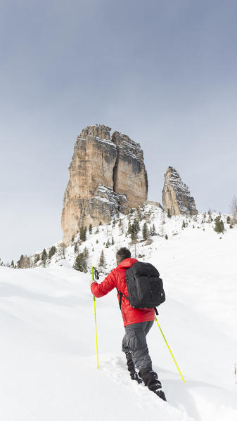 a winter trekking into the fresh snow with a beautiful dolomitic background as the Croda Rossa d'Ampezzo,Bolzano province, south Tyrol, Trentino Alto Adige, Italy, Europe