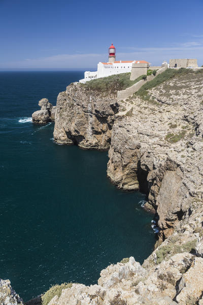 Pink sky at sunset frames the lighthouse overlooking the Atlantic Ocean Cabo De Sao Vicente Sagres Algarve Portugal Europe