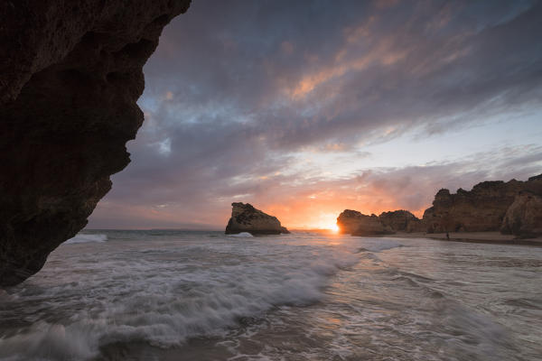 Clouds frame the rough sea and cliffs at sunset Praia Dos Tres Irmaos Portimao Algarve Portugal Europe