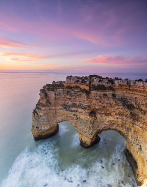 Panorama of cliffs framed by turquoise sea at dawn Praia da Marinha Caramujeira Lagoa Municipality Algarve Portugal Europe