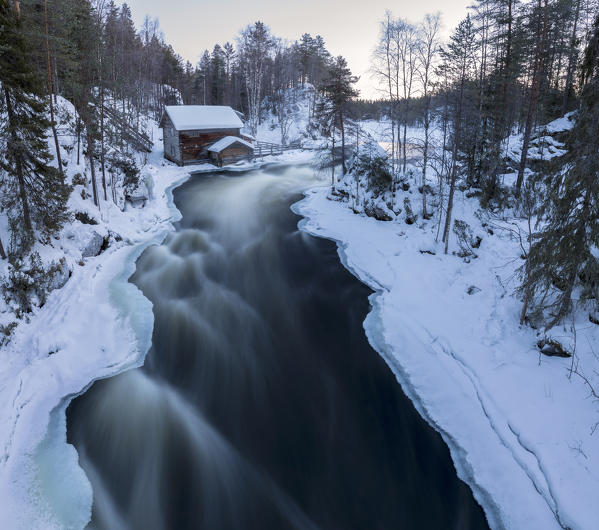 Panorama of the snowy woods framed by the pink sky at sunset Vennivaara Rovaniemi Lapland region Finland Europe