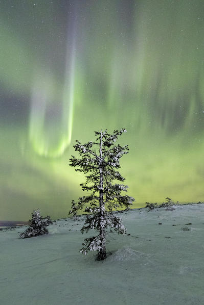 Northern lights and starry sky on the snowy landscape and the frozen trees Levi Sirkka Kittilä Lapland region Finland Europe
