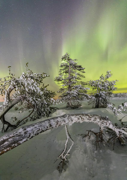 Northern lights and starry sky on the snowy landscape and the frozen trees Levi Sirkka Kittilä Lapland region Finland Europe