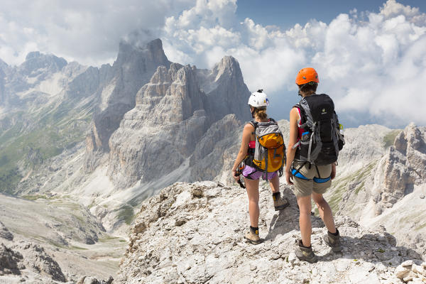 a view of two hikers climbing on the Rosengarten mountain along the via ferrata "Antermoia", Bolzano province, South Tyrol, Trentino Alto Adige, Italy, Europe,