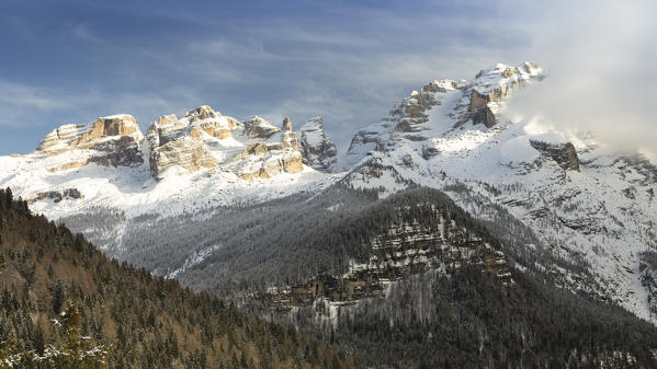 a beautiful sunset on the Brenta's peaks, refrected on a small puddle, Trento province, Trentino Alto Adige, Italy, Europe,