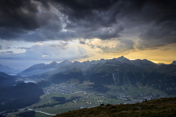 Dark clouds and sunset lights frame the rocky peaks of Muottas Muragl St.Moritz Engadine Canton of Graubünden Switzerland Europ