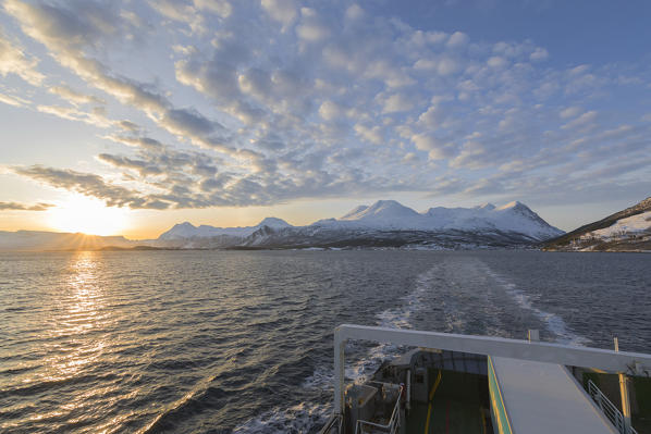 Ferry in the cold sea proceeds on its way to Lyngseidet lighted up by sunset Lyngen Fjord Lyngen Alps Tromsø Norway Europe