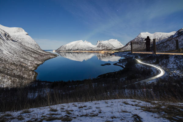 Panorama of  Northern lights and stars on the snowy peaks along the  National Tourist Route Bergsbotn Senja Tromsø Norway Europe