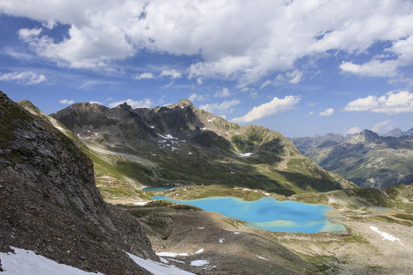 Turquoise lake framed by yellow flowers and rocky peaks Joriseen Jörifless Pass canton of Graubünden Engadin Switzerland Europe