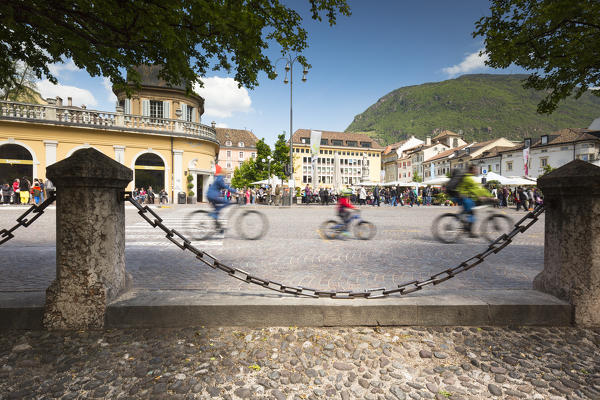 a particolar view of the Walther Square full of people and with three bikers in fore ground, Bolzano province, South Tyrol, Trentino Alto Adige, Italy, Europe,