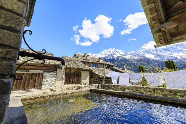 Typical fountain in the alpine village of Soglio Maloja canton of Graubunden Engadin Bregaglia Valley Switzerland Europe