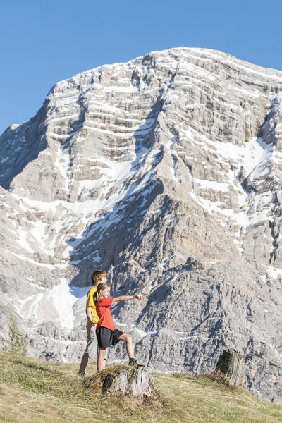 La Valle / Wengen, Alta Badia, Bolzano province, South Tyrol, Italy. Children admire the mountain panorama of Pra den Rit