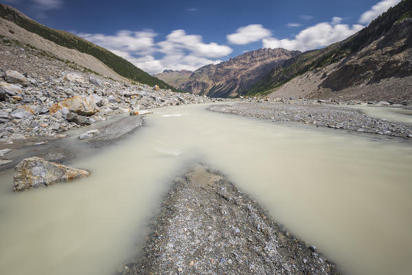 Ova da morteratsch river, Morteratsch glacier, Bernina group, Morteratsch valley, Engadine, Switzerland, Europe