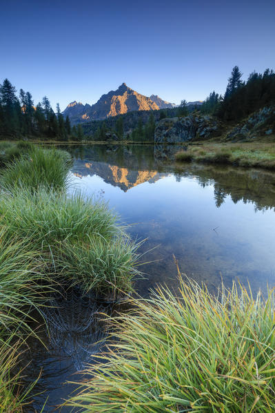 Rocky peak of Sasso Moro reflected in Lake Mufulè at dawn Malenco Valley Lombardy province of Sondrio Valtellina Italy Europe