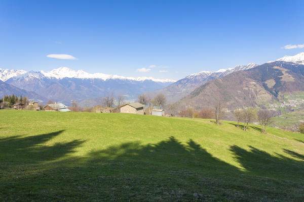 Panoramic of Rhaetian Alps in spring from Prati Nestrelli, Civo, province of Sondrio, Valtellina, Lombardy, Italy, Europe
