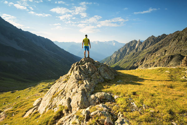 Hiker in Canè Valley, Brescia province, Lombardy district, Italy, Europe.