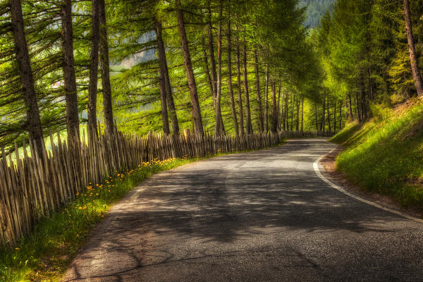 Road with fence, Funes valley, Bolzano province, South Tyrol region, Trentino Alto Adige, Italy, Europe