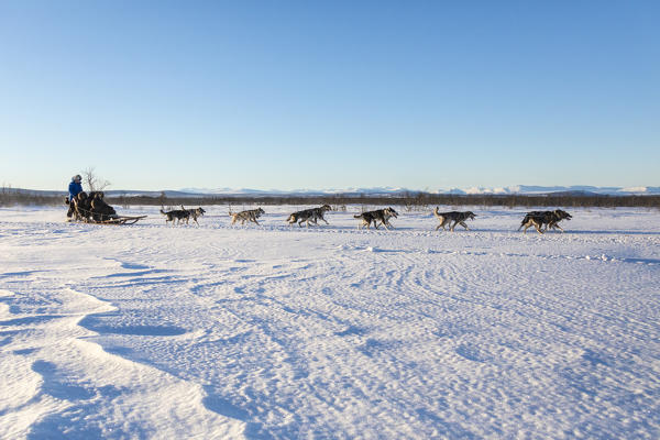 Dog sledding in the snowy landscape of Kiruna, Norrbotten County, Lapland, Sweden