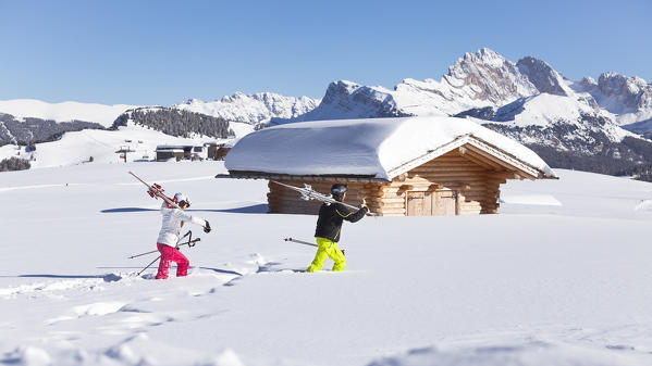 a father with his son are looking at the landscape from the top of the Seiser Alm, (Alpe di Siusi), Bolzano province, South Tyrol, Trentino Alto Adige, Italy