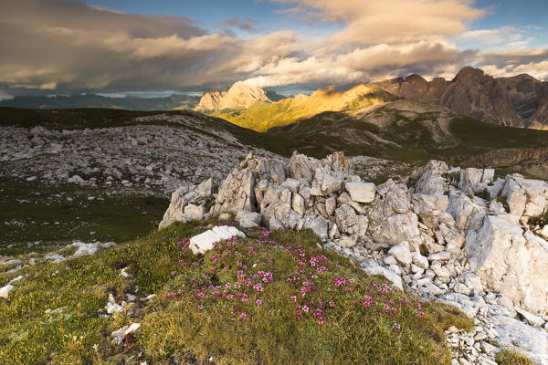 a beautiful sunset from the top of the Schlern (Sciliar) with alpine flowers in the foreground, Bolzano province, South Tyrol, Trentino alto Adige, Italy