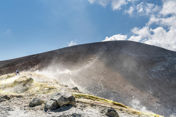 Volcano, Messina district, Sicily, Italy, Europe. Sulfur fumaroles on the crater rim of Vulcano.